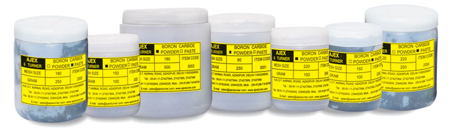 Carbolax powder/paste is suitable for a large variety of materials ranging from plastics (Eg. Teflon), nonferrous metals and steel to titanium and metallic carbides. Boron carbide is a super hard abrasive material, next only to diamond and cubic boron nitride in hardness. it simply outclasses the conventional abrasive like aluminum oxide and silicon carbide with its superlative and cost effective performance.